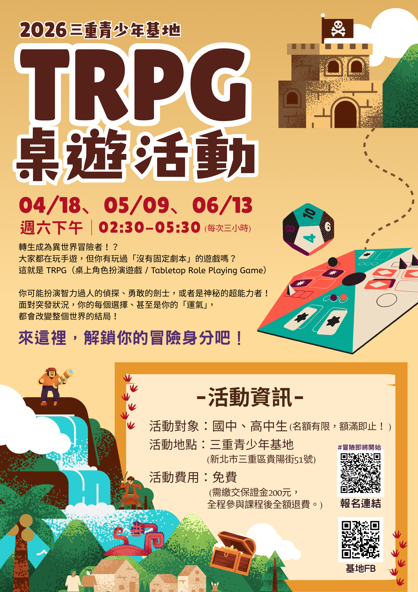 人本三重青少年基地於4/18、5/9、6/13周六下午2:30-5:30, 舉辦【TRPG桌上角色扮演遊戲】活動