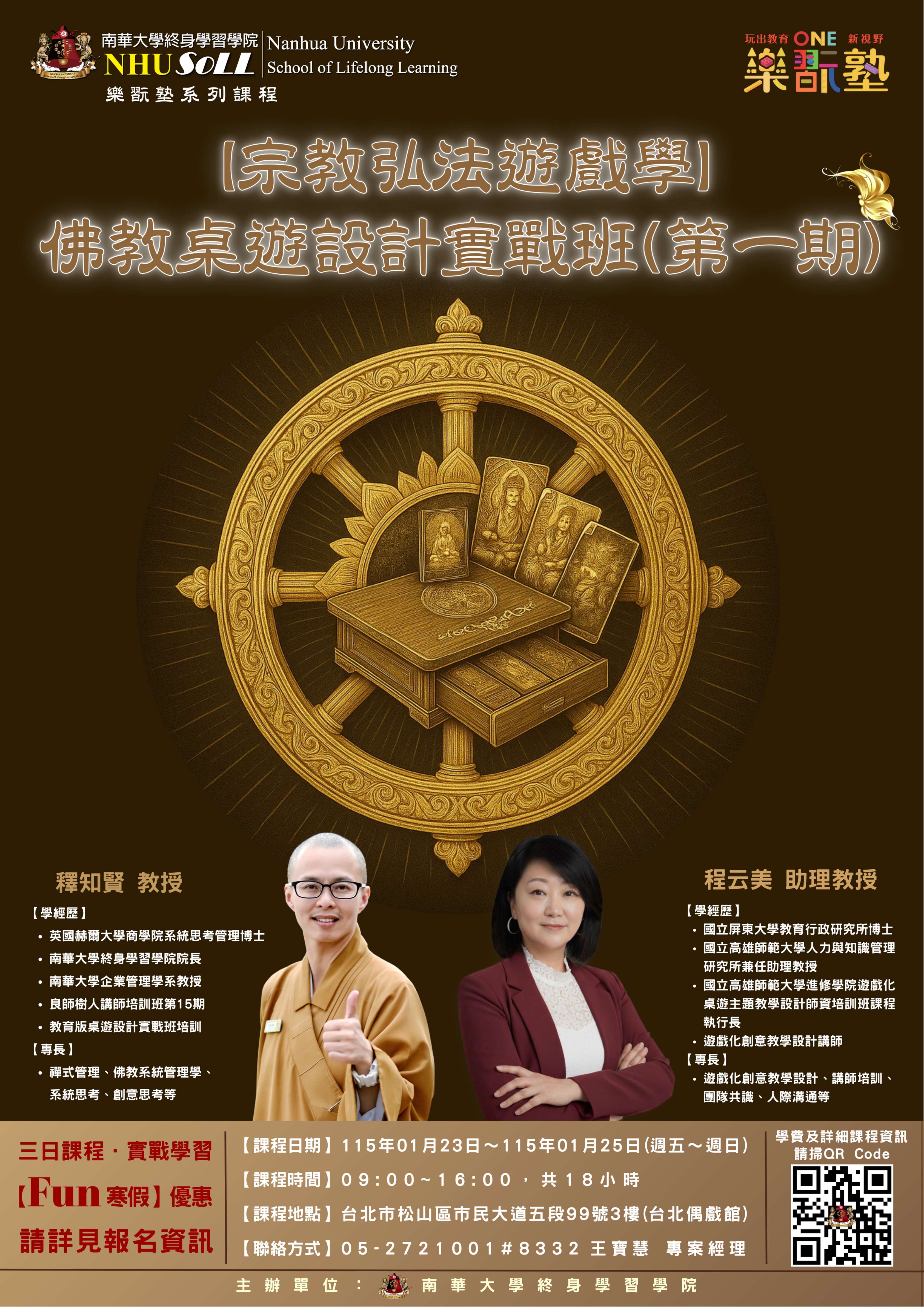 (二) 講師將學習如何設計融合佛教義理的桌遊,讓學生在遊戲中輕鬆了解佛法。透過設計多樣化的桌遊及遊戲規則,宣揚佛教教義,增強教學成效。