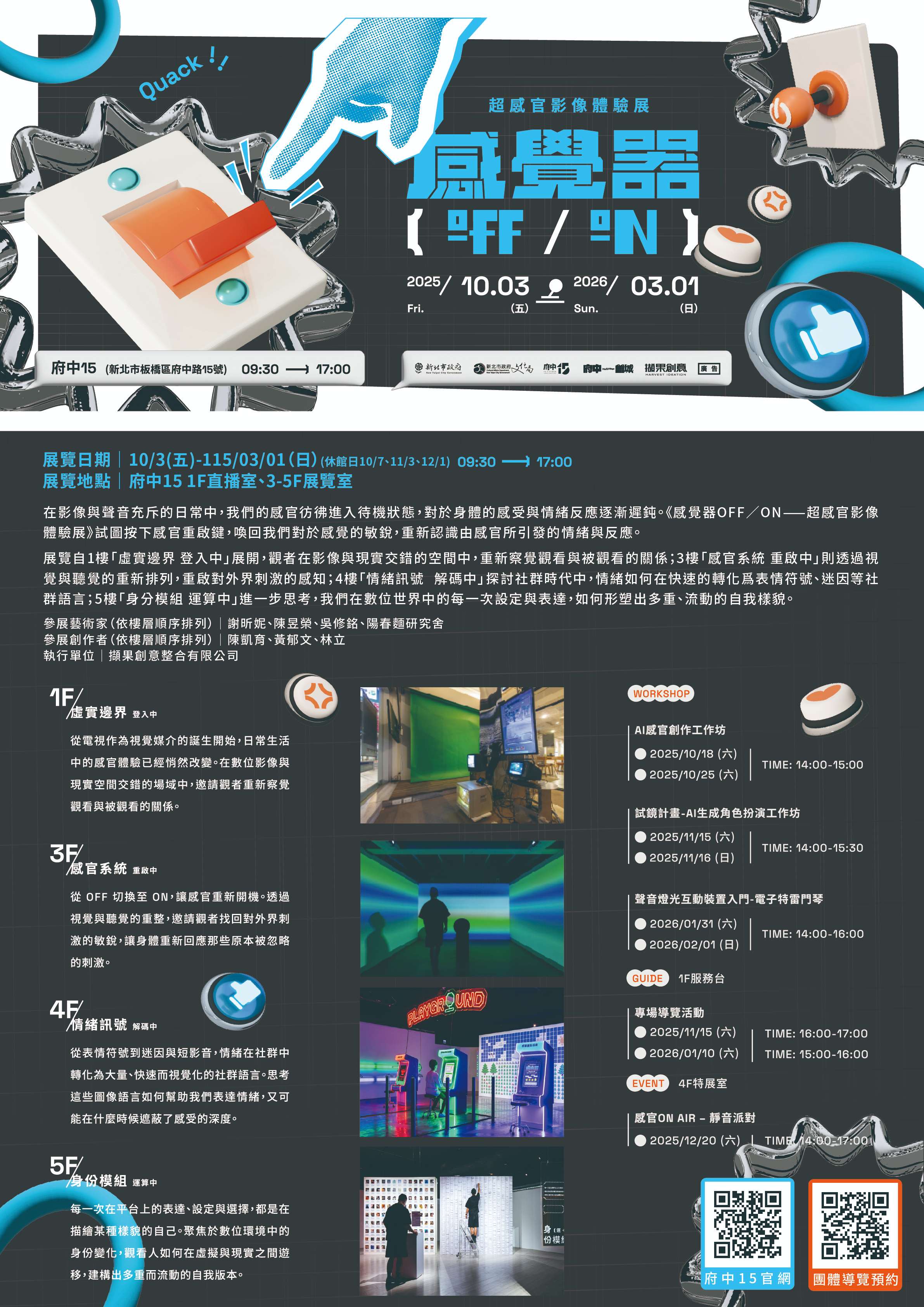 一、府中15「感覺器OFF/ON─超感官影像體驗展」,從數位影音使用現象與感官疲乏出發,結合新世代影像創作者視角,以輕鬆幽默方式,反映時下議題,並創造年輕世代共感,引導觀眾體驗並重新思考數位環境下的感官真實性。