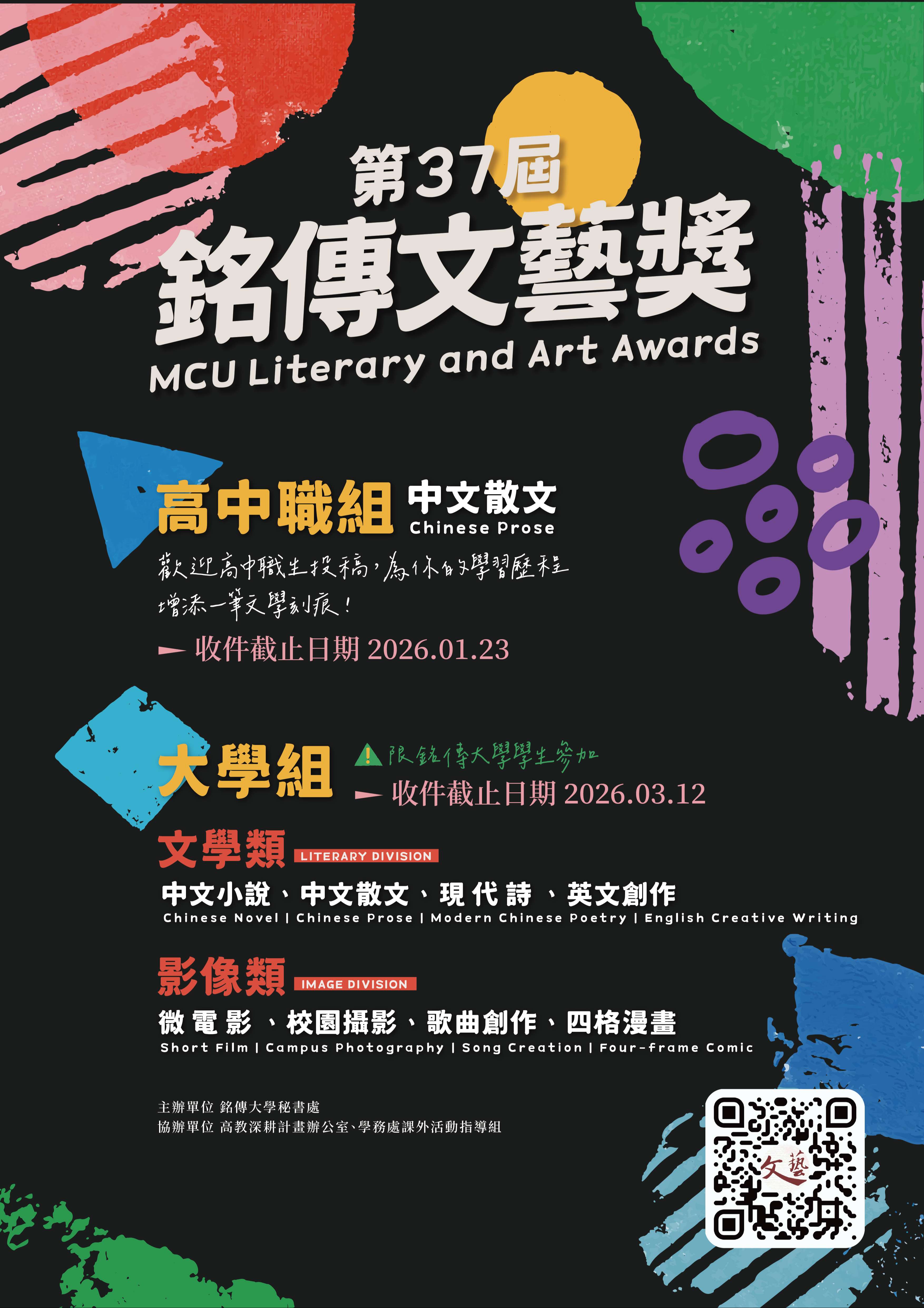 一、為提倡寫作風氣,提昇學生文學創作素養,培育文藝人才,本校由秘書處主辦「第37屆銘傳文藝獎」,並設立高中職中文散文組。