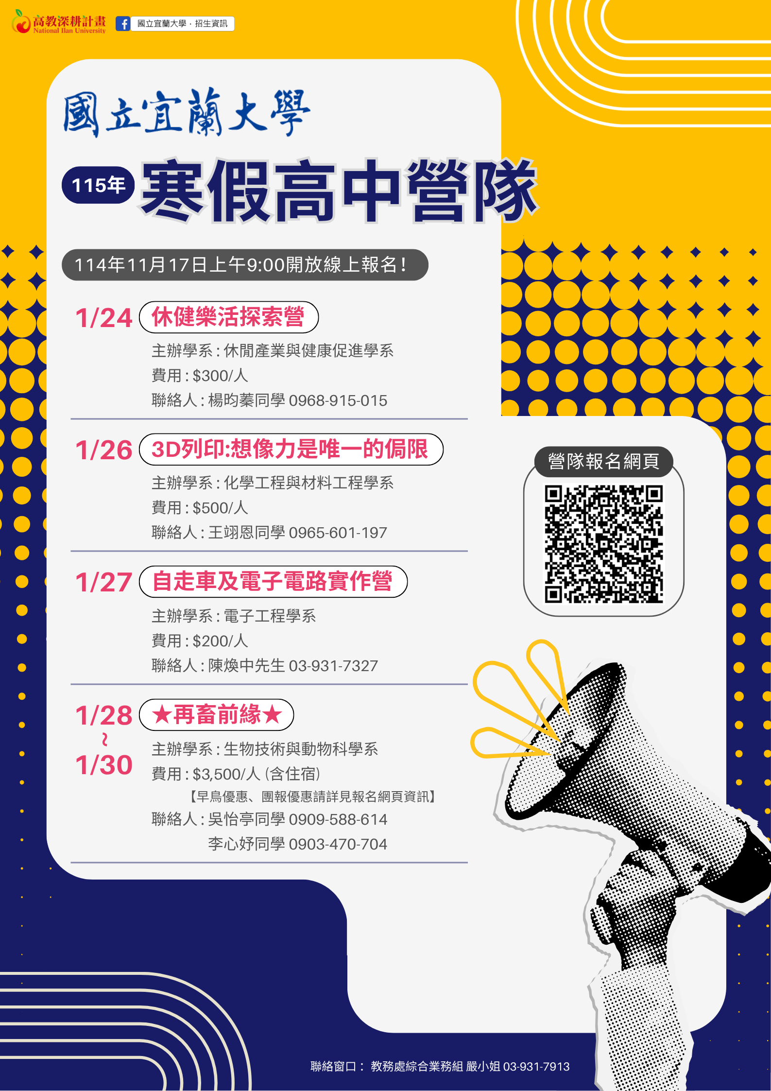 一、檢附活動海報乙份,完整訊息請至活動網站(網址: https://sites.google.com/ems.niu.edu.tw /115winter),或由國立宜蘭大學首頁(網址: https://www.niu.edu.tw)/招生資訊/在宜大夢想起飛/高中營隊查詢。