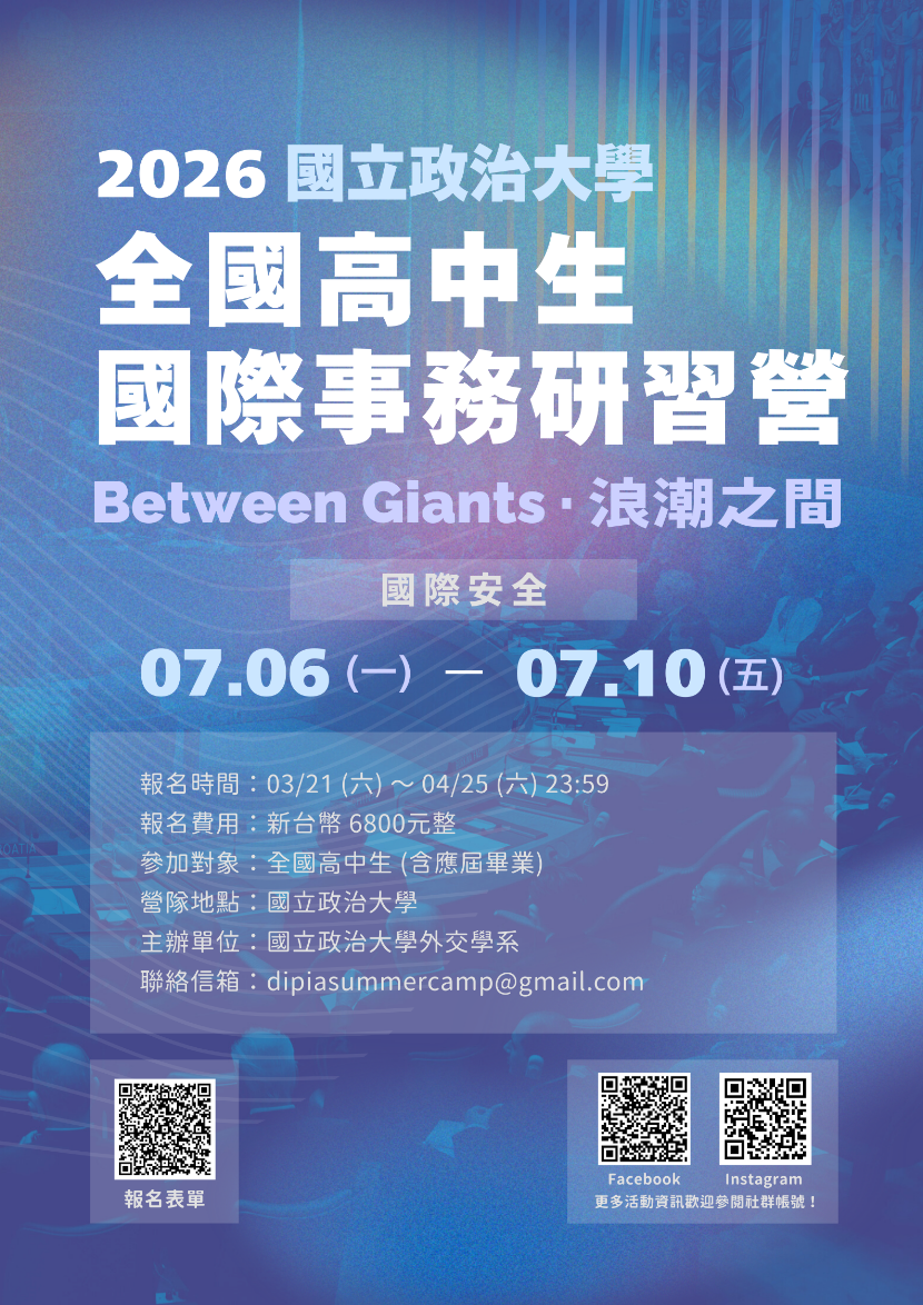 三、檢送活動海報電子檔。相關活動資訊請上活動頁面查詢: https://www.instagram.com/nccudip_iasc? igsh=NmhseXgxdGRjbTFo&utm_source=qr,或IG搜尋「2026政大外交國際事務研習營」。https://www.facebook.com /share/1Aoi7ajNSf/?mibextid=wwXIfr或FB搜尋「全國高中生國際事務研習營」。