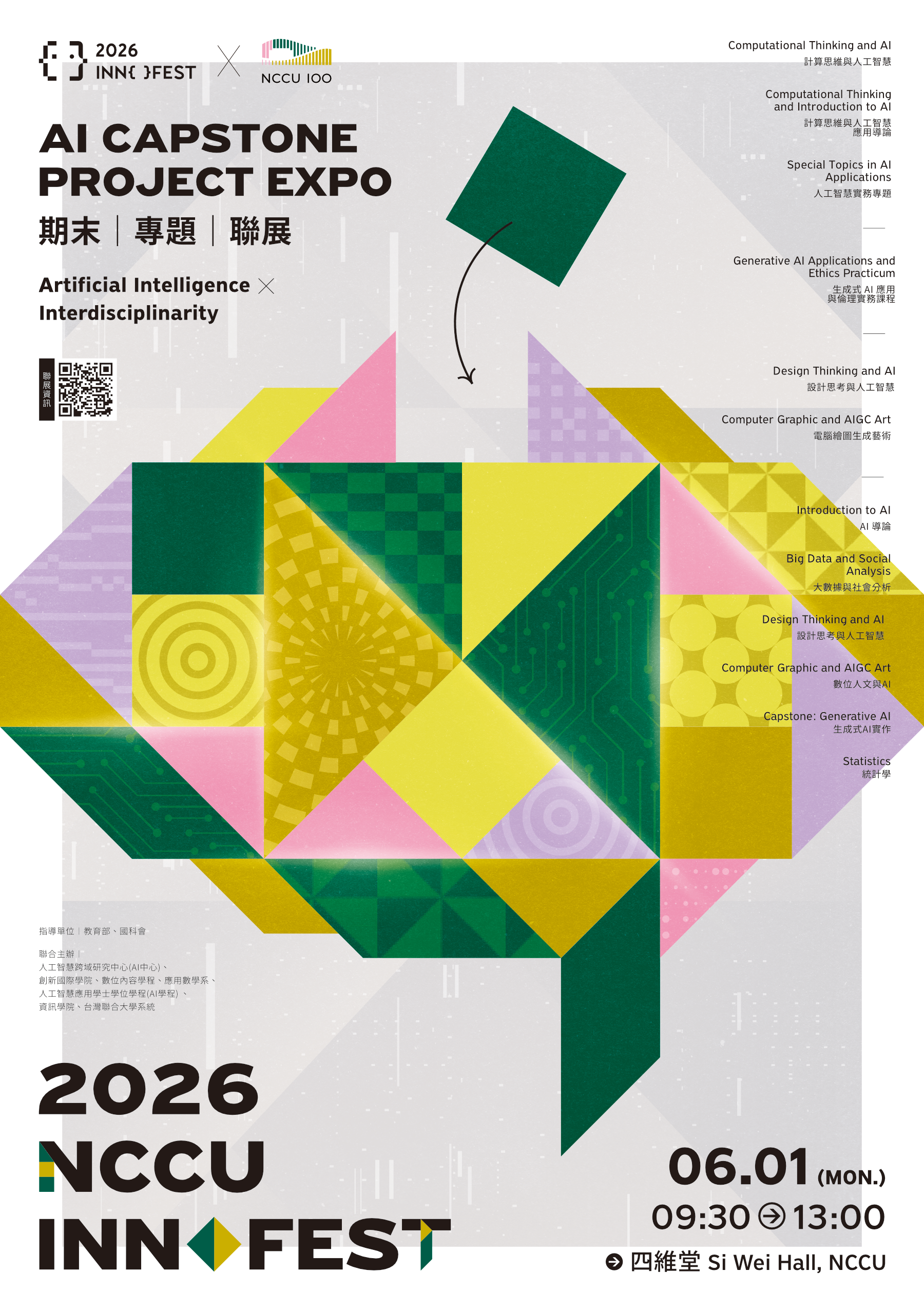 一、為推動人工智慧之跨領域發展與應用,本校人工智慧跨域研究中心(AI中心)將於本(115)年6月1日辦理「2026 NCCU Innofest(114-2學期課程期末海報聯展)」。