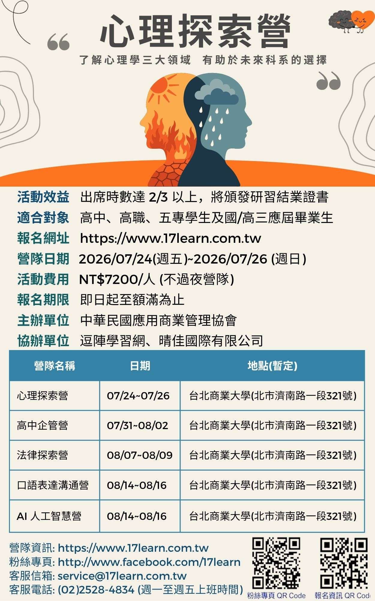 十、另有【AI 人工智慧營】、【口語表達溝通營】、【高中企 管營】、【法律探索營】等營隊,歡迎報名參加。有關營 隊問題,請洽詢課務中心: service@17learn.com.tw,或 是私訊粉絲專頁:https://www.facebook.com/17learn